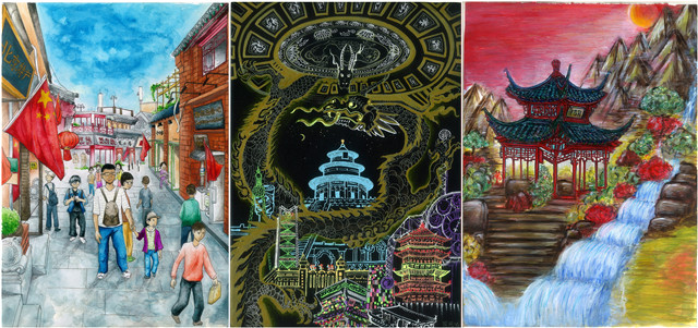 韓國留學生金荷恩說:龍是中國的象征,在故宮到處能看到龍的形象;天壇、頤和園、奧林匹克公園、三里屯等代表著北京的過去和現在。把它們融合在一起,就是我心中的北京。