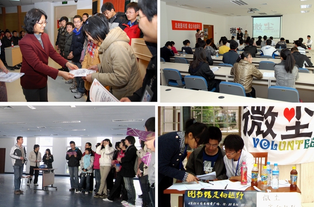 “微塵志愿者隊”是為了向圖書館提供志愿服務(wù)而成立的學(xué)生社團,自2010年9月成立以來,在基礎(chǔ)教育學(xué)院理材學(xué)部和徐特立圖書館的共同培育下,志愿者隊伍不斷發(fā)展、壯大,由最初的21人發(fā)展到現(xiàn)在的160多人。他們秉承“服務(wù)他人,快樂自己”的信念,利用課余時間參與圖書、報刊整理等看似簡單而又平凡的工作。但簡單的事認真做就不簡單,平凡的事堅持做就不平凡。他們憑借自己的雙手、頭腦、知識和愛心持之以恒地真心奉獻,不斷創(chuàng)新工作方法,拓寬工作內(nèi)容,以高度的責(zé)任心來實現(xiàn)“高效率、高品質(zhì)”的志愿服務(wù)。開館的每一天,在閱覽室內(nèi)、書刊架旁都可以看到他們忙碌的身影,至今已累計志愿服務(wù)2500余小時,為圖書館優(yōu)化讀者服務(wù)工作做出了突出貢獻。