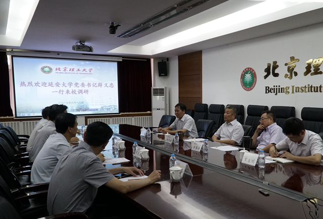 2017年6月12日下午,延安大學黨委書記薛義忠、副校長王剛一行來校調研。北京理工大學黨委書記趙長祿、副校長方岱寧、校長助理、學校辦公室主任汪本聰會見了薛義忠一行并舉行會談。
