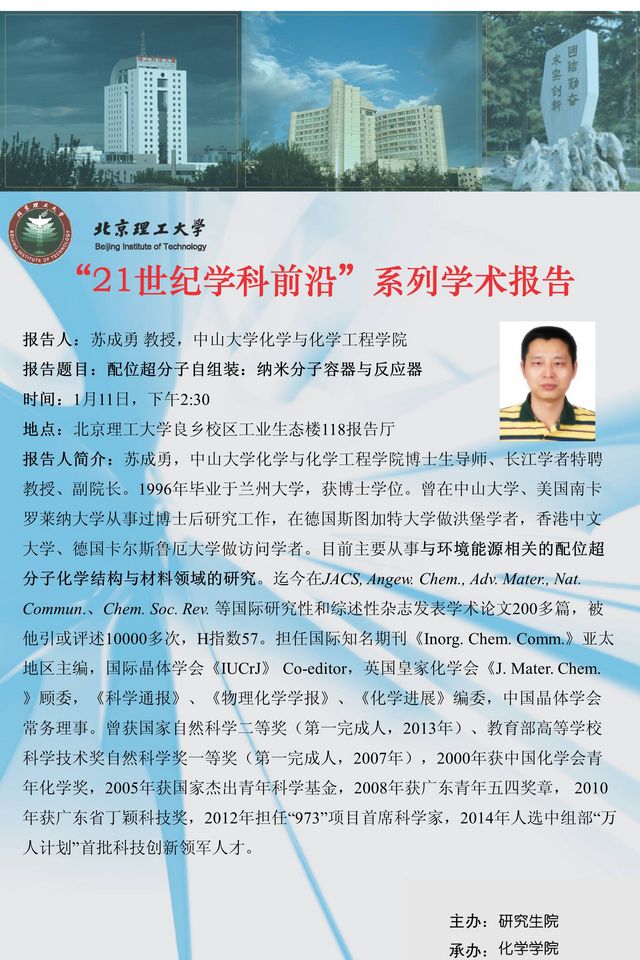 【化學學院】“21世紀學科前沿”蘇成勇教授學術報告通知