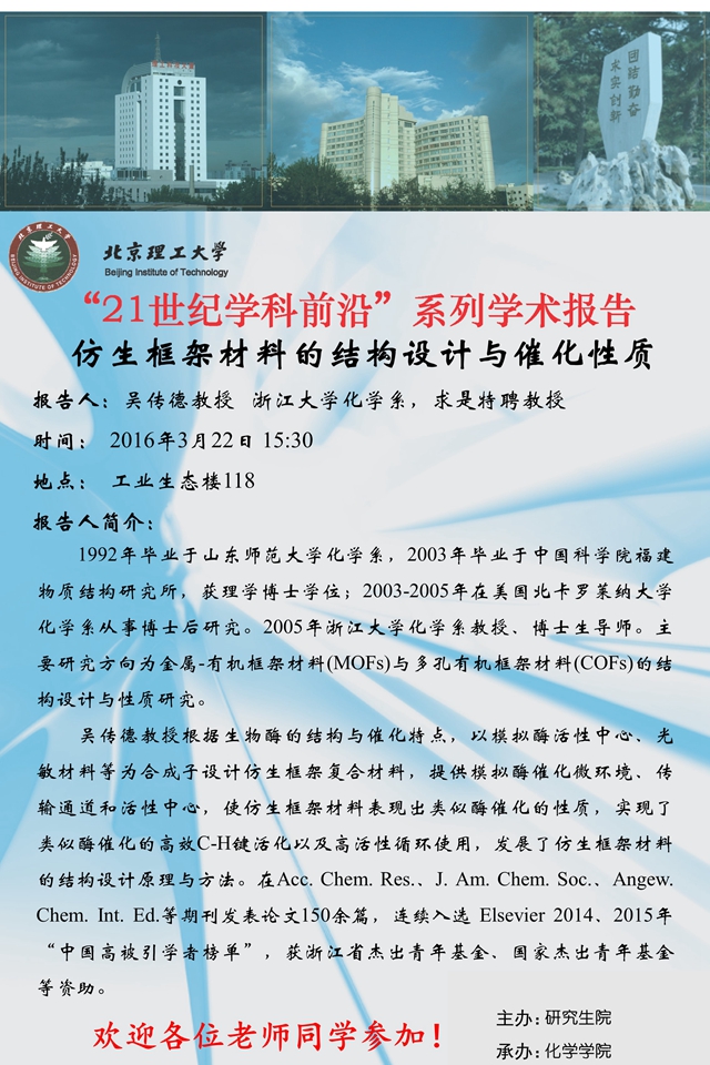 【化學學院】“21世紀學科前沿”吳傳德教授學術報告通知