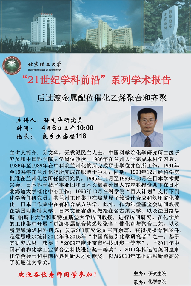 【化學(xué)學(xué)院】“21世紀(jì)學(xué)科前沿”孫文華研究員學(xué)術(shù)報(bào)告通知