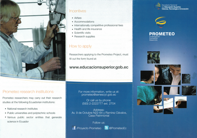一一今收到厄瓜多爾駐華使館發來的普羅米修斯項目介紹,該項目旨在鼓勵高等研究人員及科學家到厄瓜多爾進行最長為期一年的學術研究和項目開發,費用和薪金全部由厄瓜多爾政府承擔。希望感興趣的老師積極申報普羅米修斯項目。