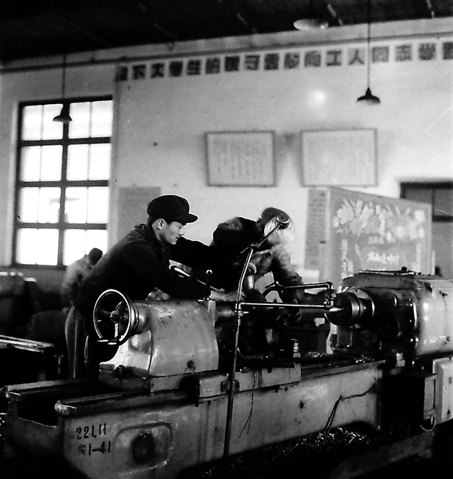 延安自然科學院時期學生們在校辦工廠學習鉗工