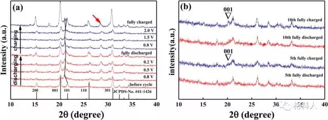 V2O5-Al電池首周充放電時,101峰的位置發生不可逆的左移,說明在首周放電過程中V2O5發生了不可逆的結構變化。在隨后的充放電循環中,001峰隨著充放電發生了可逆的有規律的強度變化。正極材料的結構變化也印證了首周放電反應的不可逆性和第二周之后的電化學反應可逆性的差異。