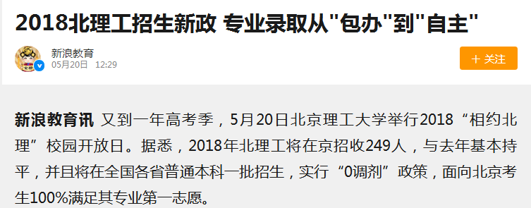 【新浪網(wǎng)】2018北理工招生新政 專業(yè)錄取從"包辦"到"自主"
