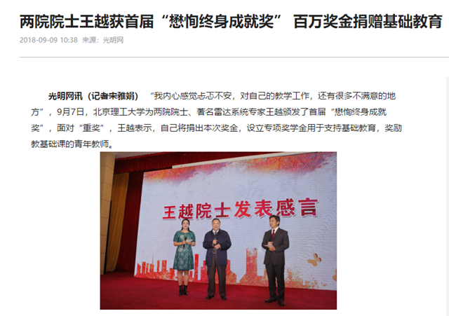 在第34個教師節到來之際,中國科學院院士、中國工程院院士、著名雷達與通迅系統專家王越獲得北京理工大學今年首次設立的人才培養工作最高榮譽“懋恂終身成就獎”。