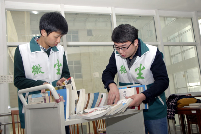 在常人看來,圖書館的圖書上架工作是繁重而枯燥的,同樣的動作要重復幾百次,幾千次,然而這些枯燥繁重的工作在志愿者的眼睛里有了不一樣的內容,收獲了不一樣的快樂。微塵志愿者張哲大一時加入微塵,在徐特立圖書館內進行志愿服務,他說:“上書、順架等工作和我課表上的課一樣,成了每周必去完成的事”。大一時他也曾參加過支教、敬老等志愿公益服務,他說:“對我來說,圖書館內的服務是最不一樣的,每次把要上的書順好,認真的找到每一本書的位置、放好,每放好一本書,心中都會感到很開心”。正是源自內心的快樂,源自這份簡單的想為同學服務的目的,內心也就是在無意之間收獲了慢慢的感動,最終升華為個人品質的提升。他說:“每次看到書庫室內的書一本一本的被放好,我就覺得,我們做的事情很有意義”。胡銳說:“與微塵相遇每周我都會去,有時候一下課就飛奔圖書館,也有時候漫步悠閑地走過去,仿佛這是一件舒服、享受而愉悅的事情一般。每當我整理圖書時,我好像忘記了全世界。沉浸在書的海洋,漫步于知識的殿堂,可以忘記三千煩惱”。在他的眼里書仿佛一個個精靈,在手指間舞動,最后回到自己該在的位置,等待下一次被啟用;在他眼里書是一個很神奇的東西,能啟發某種靈感,能開闊心結和思維,卻默默無聞地安靜地待著。它仿佛繼承了樹所有的精神,并使之升華,激發,燃燒……也正是源于這份對書的忠誠和對圖書館的喜愛,才讓這份純粹的愛化作源源不斷的動力,化作執著的信念一路堅守在圖書館志愿服務的崗位上。