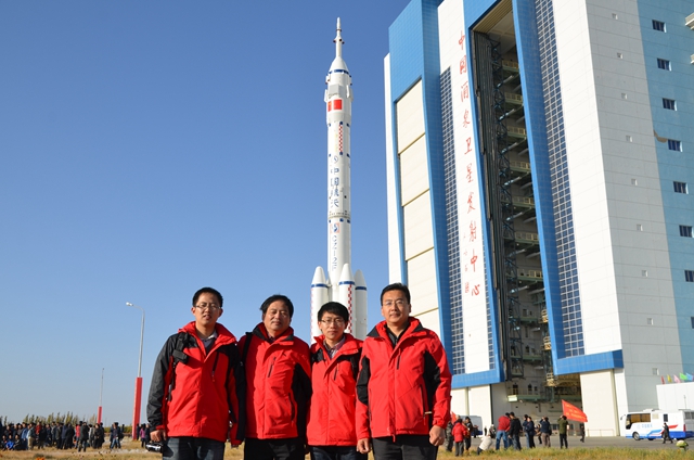 楊春華與項目組部分師生在“神舟八號”酒泉衛星發射中心現場