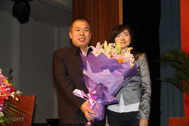 報告團成員演講結束后,領航獎學金獲得者、機械與車輛學院2010屆本科畢業生鄭瑞琴手捧鮮花代表優秀畢業生向辛勤培育他們的母校表達了謝意,李和章校長代表學校接受了畢業生獻禮。