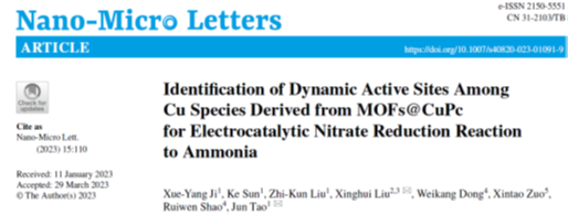 近日,北京理工大學(xué)化學(xué)與化工學(xué)院陶軍教授團(tuán)隊(duì)在電催化硝酸根還原制氨方面取得重要進(jìn)展。相關(guān)研究成果以“Identification of dynamic active sites among Cu species derived from MOFs@CuPc for electrocatalytic nitrate reduction reaction to ammonia”為題,在國際知名期刊《納微快報(bào)》(Nano-Micro Letters)上發(fā)表(DOI:10.1007/s40820-023-01091-9)。該工作以北京理工大學(xué)為第一通訊單位,陶軍教授和韓國成均館大學(xué)的劉性輝博士為共同通訊作者,博士研究生冀學(xué)洋為該論文的第一作者。該文章也得到了北京理工大學(xué)醫(yī)工融合研究院邵瑞文副研究員團(tuán)隊(duì)在雙球差校正掃描透射電子顯微鏡方面的技術(shù)支持。