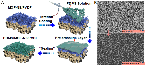 圖4. PDMS改性MOF-NS/PVDF膜的制備工藝、結(jié)構(gòu)及表面特性:(A)滴涂改性過程示意圖;(B)滴涂改性前后膜表面微觀形貌變化。