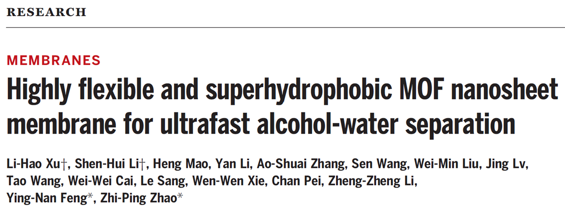 10月21日,北京理工大學(xué)化學(xué)與化工學(xué)院趙之平教授團(tuán)隊(duì)在柔性MOF膜制備研究領(lǐng)域取得突破性進(jìn)展,相關(guān)研究成果以“Highly-flexible and superhydrophobic MOF nanosheet membrane for ultrafast alcohol-water separation”為題,在《 Science 》上發(fā)表(DOI: 10.1126/science.abo5680),研究團(tuán)隊(duì)提出了一種在聚合物基底中包埋晶種進(jìn)而通過表面晶體誘導(dǎo)生長(zhǎng)法精確構(gòu)筑MOF納米片膜的新構(gòu)想,在聚合物基底表面實(shí)現(xiàn)了高柔性超疏水MOF膜的層次構(gòu)建,解析了納米片的晶體結(jié)構(gòu)及其內(nèi)部的傳質(zhì)通道,揭示了聚合物與納米片層在分離過程中的協(xié)同機(jī)制,突破了柔性MOF膜制備瓶頸,為規(guī)模化制備和應(yīng)用提供了理論依據(jù)和技術(shù)支撐。該工作第一作者為化學(xué)與化工學(xué)院化學(xué)工程研究所博士研究生徐李昊、李申輝,通訊作者為趙之平教授、馮英楠副研究員,北京理工大學(xué)是該工作的唯一完成單位。