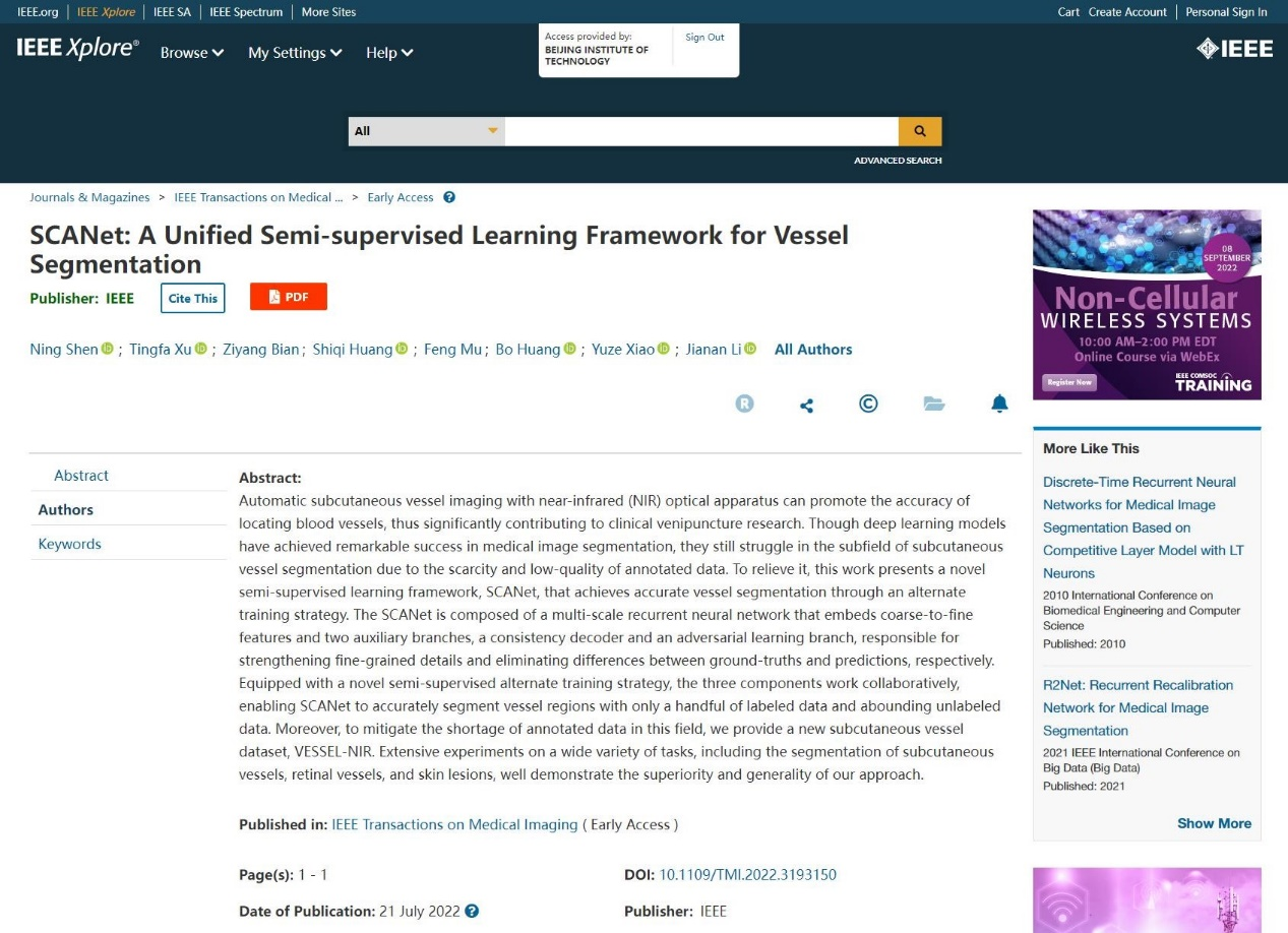 近日,北京理工大學光電學院許廷發教授科研團隊在紅外靜脈血管醫學圖像處理領域取得新突破,相關研究成果以“SCANet: A Unified Semi-supervised Learning Framework for Vessel Segmentation”為題發表在醫學圖像處理領域的國際頂級期刊IEEE Transactions on Medical Imaging(IEEE TMI,IF="11.037)。IEEE" TMI是醫學圖像處理領域具有高影響力的國際學術刊物之一,在2021-2022年該領域270余種JCR期刊中排名前列,影響因子為11.037,中科院一區,主要發表和報道醫學圖像處理和分析、可視化和性能等領域的最新原創研究成果。該工作第一作者為北京理工大學光電學院博士研究生沈寧,通訊作者為北京理工大學光電學院李佳男特別副研究員和許廷發教授。