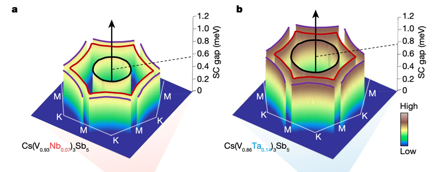 進一步地,研究人員通過細致的化學替換,將部分釩原子可控地替換為同族更大的鈮或鉭原子,從而精確調控超導序和電荷密度波序(圖2)。通過對相圖中有無電荷密度波序的區域進行比對研究,發現超導能隙均顯示為無節點和各向同性(圖3)。如此穩健的能隙結構極大縮窄了超導配對對稱性的候選范圍,同時結合繆子散射實驗發現該超導態破壞時間反演對稱性,指向了 d + id 波超導配對的可能性。