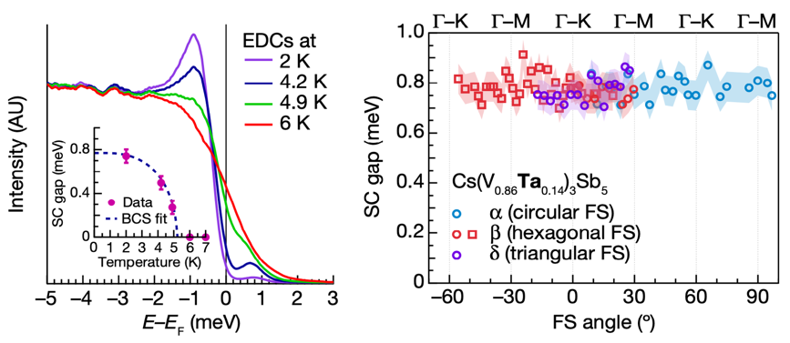 圖1.Cs(V0.86Ta0.14)3Sb5超導能隙的高精度譜學特征(左)及其動量依賴關系(右)