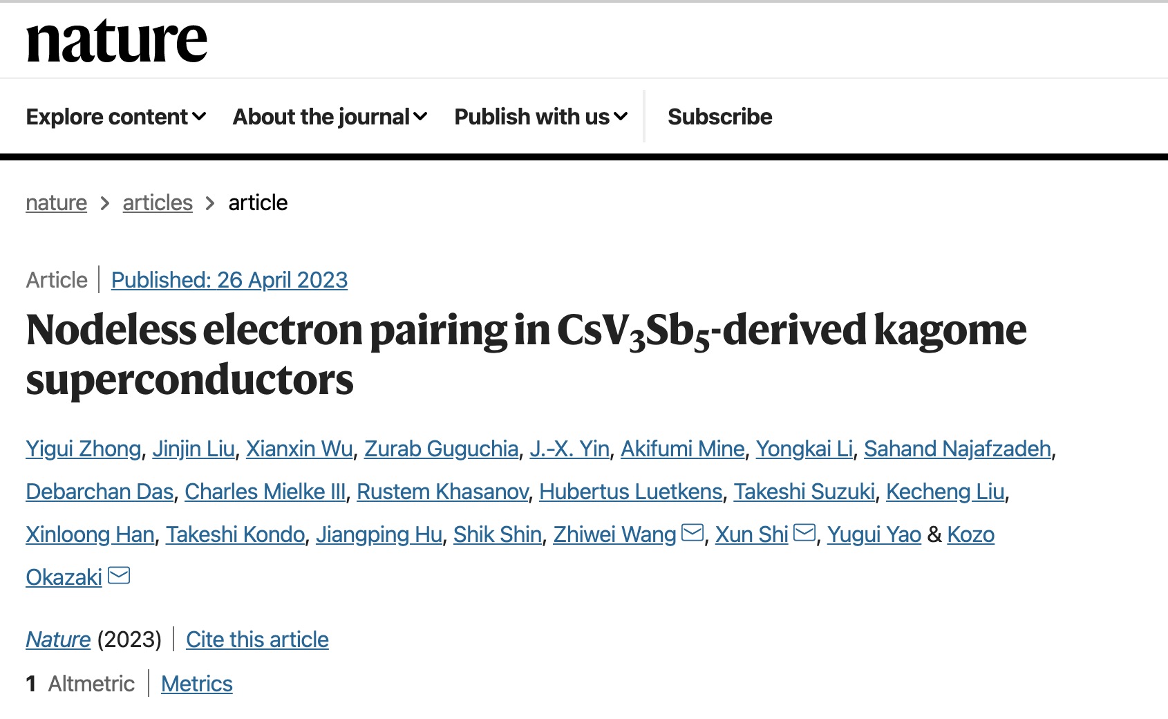 近日,北京理工大學物理學院姚裕貴教授、施訓教授、王秩偉研究員團隊,與東京大學鐘益桂博士、Kozo Okazaki教授,中科院理論物理研究所吳賢新研究員,南方科技大學殷嘉鑫教授和瑞士保羅謝勒研究所Zurab Guguchia教授等人合作在《自然》雜志發表論文“Nodeless electron pairing in CsV3Sb5-derived kagome superconductors”,揭示了籠目超導體中穩健的無節點超導能隙,為研究其超導配對機理提供了關鍵實驗依據。