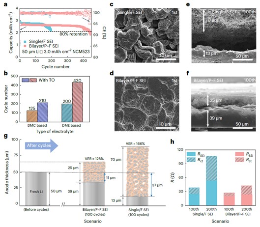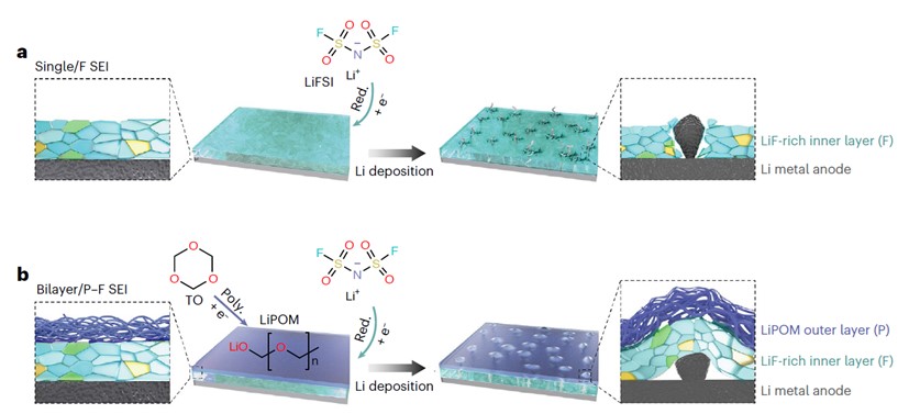 單層SEI是局部高鹽中LiFSI衍生的富含LiF的SEI,在鋰沉積過程中易破裂-再生。雙層SEI是由富含LiF的內層和高機械穩定性的LiPOM外層構成,能夠緩解SEI的破裂-再生。