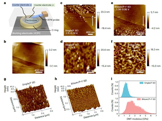 圖4. 原位電化學原子力顯微鏡分析了SEI的形成過程和力學穩定性。(a)原位電化學AFM電池示意圖。(b) HOPG在OCP (3.0 V)下的AFM形貌圖。循環伏安法掃描(c, d)單層SEI和 (e, f)雙層SEI的AFM形貌圖。(g)單層SEI和 (h) 雙層/SEI的高度圖像。(i)單層SEI和雙層SEI的DMT模量分布。