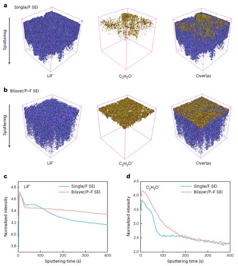 圖3. 用ToF-SIMS分析了SEI的三維納米結構。(a)單層SEI和(b)雙層SEI的ToF-SIMS三維圖像。(c) LiF?和(d) C2H2O?在不同SEI中對應的ToF-SIMS深度曲線。