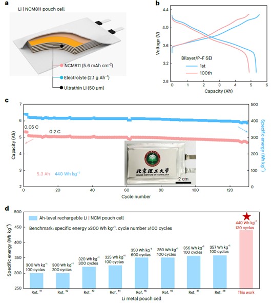 圖6. 雙層SEI 在440 Wh kg?1級軟包電池中的循環性能。(a) 440 Wh kg?1級Li | NCM811軟包電池示意圖。(b) 軟包電池的充放電曲線。(c) Li | NCM811軟包電池的循環性能。(d) 軟包電池循環性能與文獻報道的性能對比圖。