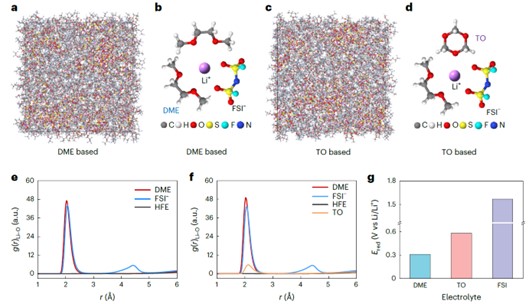 圖2. DME和TO基電解液的溶劑化結構和還原行為。(a) DME-和 (c) TO-電解液的MD模結果。(c)DME-和 (d) TO-電解液中代表性的鋰離子溶劑化層的示意圖。(e) DME-和 (f)TO-電解液中Li-ODME、Li-OFSI?、Li-OHFE和Li-OTO的RDF圖。(g) 基于密度泛函理論計算的DME、TO和FSI?的還原電位。