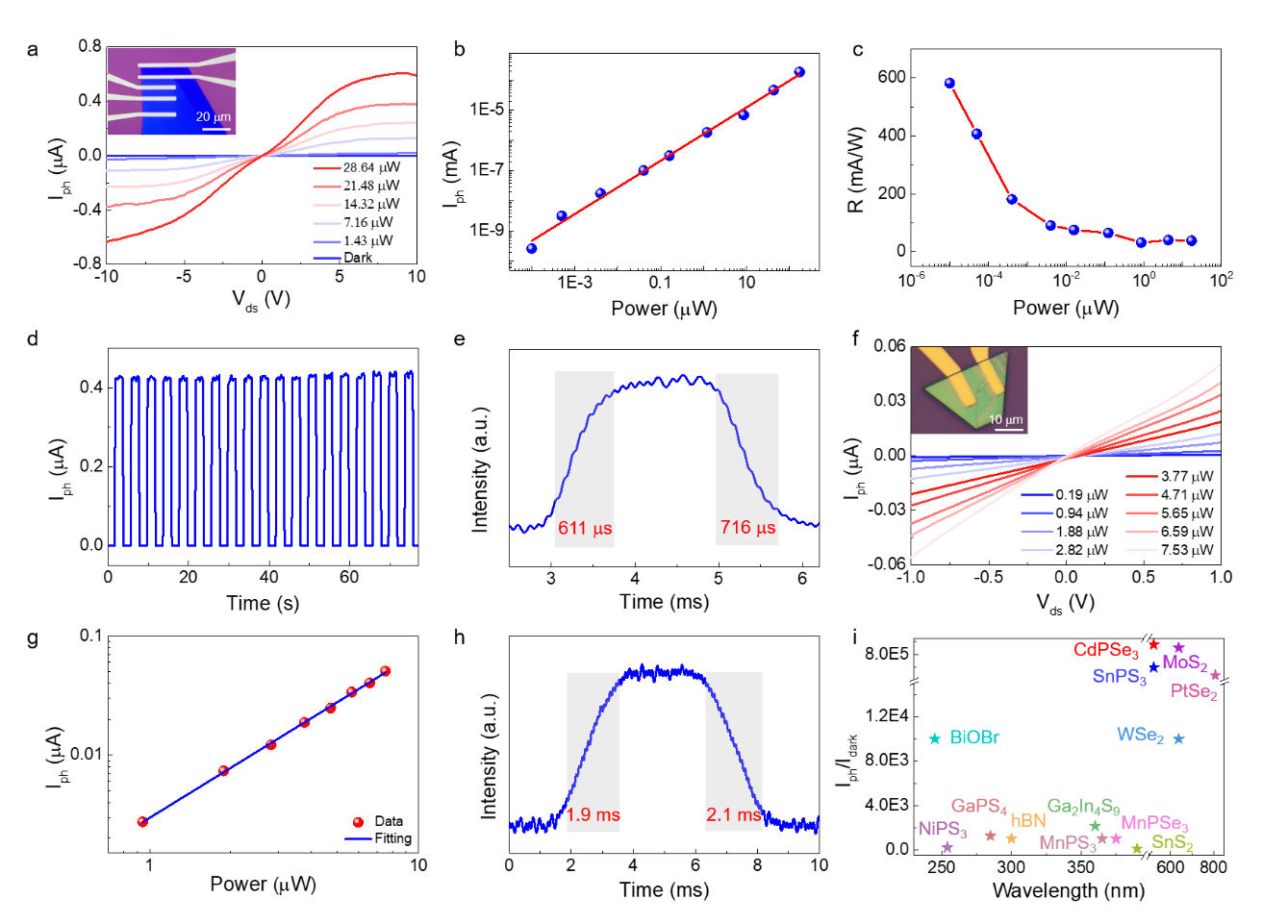 為了進一步研究其光電性能,制備了基于CdPSe3和SnPS3納米片的光電探測器。所有測試均采用520 nm激光。不同功率強度下,CdPSe3器件的功率依賴性光電流的對數形式與功率密度呈正相關。通過Iph≈Pθ可以很好地擬合,其中θ是與光響應強度相關的指數。此外,線性動態范圍(LDR)是光電探測器的一種性能指標,用于表征光強范圍,在此范圍內光電探測器保持恒定的響應率。根據LDR = 20log(Iph/Idark)的公式計算得出光敏LDR為120 dB,遠大于商用InGaAs光電探測器的66 dB和其他二維材料如GaPS4的62 dB。基于CdPSe3的光電探測器響應度可高達582 mA/W,對應的比探測率為3.19′1011 Jones,對可見光的探測能力極佳。上升時間和衰減時間分別為611 ms和716 ms,優于大多數其它已報道的二維TMPCs光電探測器。值得注意的是,CdPSe3和SnPS3光電探測器由于其超低暗電流,比其它報道的二維材料具有更高的開關比。