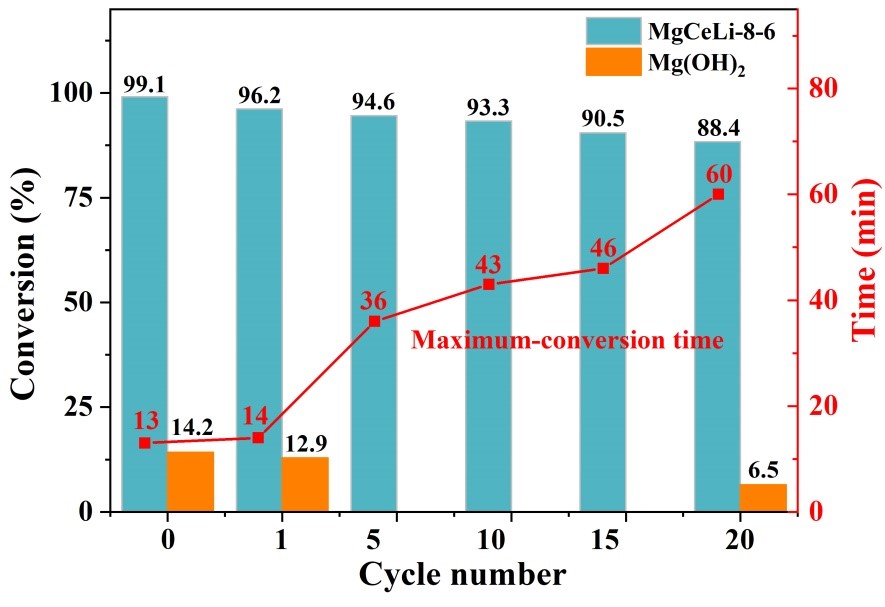 圖2 純Mg(OH)2和MgCeLi-8-6復(fù)合材料的最大轉(zhuǎn)化率、最大轉(zhuǎn)化時(shí)間和循環(huán)次數(shù)的關(guān)系
