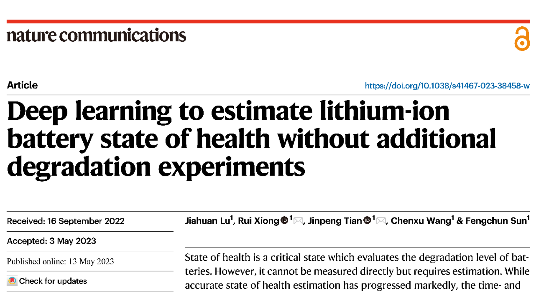 近日,北京理工大學電動車輛國家工程研究中心孫逢春院士、熊瑞教授團隊在《自然通訊》雜志上發表論文“Deep learning to estimate lithium-ion battery state of health without additional degradation experiments”,提出了不依賴額外電池老化測試的健康狀態快速評估方法。該方法直接利用已有電池數據實施新電池健康狀態評估,打破了電池健康狀態評估對完備測試數據的依賴性。