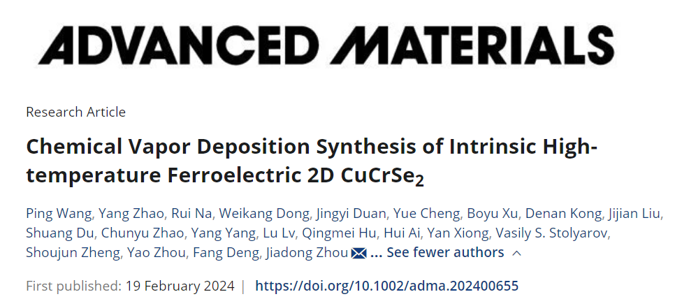文獻信息:Chemical Vapor Deposition Synthesis of Intrinsic High-temperature Ferroelectric 2D CuCrSe2. (Adv. Mater., 2024, DOI: 10.1002/adma.202400655)