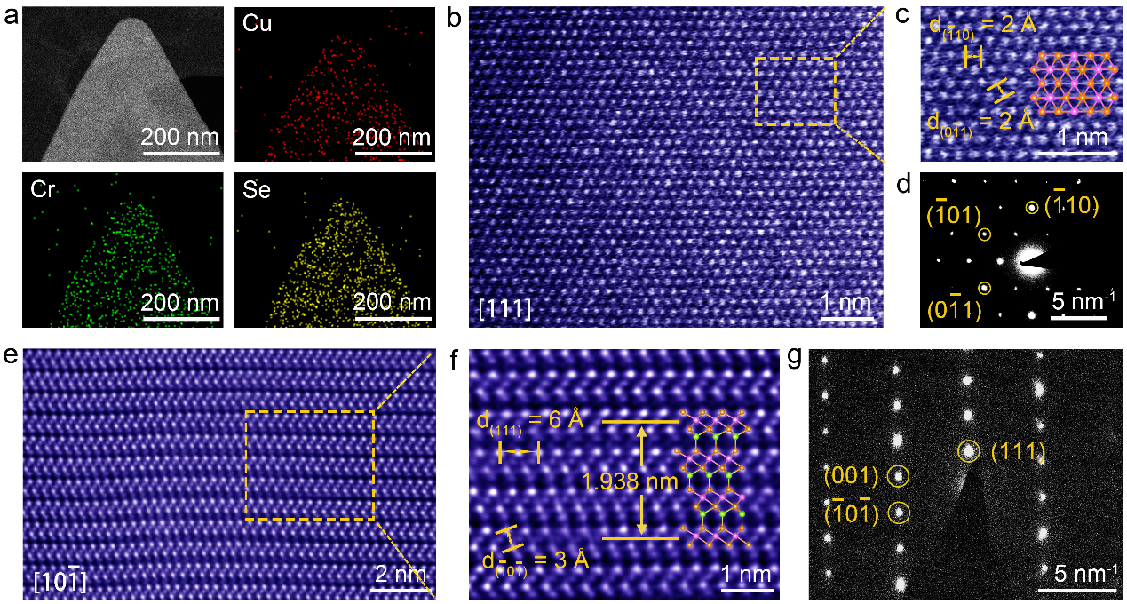 利用高分辨球差電子顯微鏡對合成的CuCrSe2樣品晶體結構進行研究。圖3a顯示了超薄CuCrSe2納米片的低分辨射電子顯微鏡圖像,其中能譜(EDS)圖體現出CuCrSe2中Cu、Cr和Se元素均勻分布,證明獲得了高質量CuCrSe2晶體。圖3b給出沿[111]晶軸方向的CuCrSe2納米片平面STEM圖,這與預測的CuCrSe2晶體模型一致。圖3d中CuCrSe2沿[111]軸向對應的SAED花樣證實了所合成樣品為高質量單晶。CuCrSe2納米片沿[10-1]晶軸方向的HAADF-STEM圖如圖3e所示。顯然,Cu原子插層進入到CrSe2層間,與CuCrSe2晶體的模擬截面STEM圖相吻合。此外,對應的SAED花樣(圖3g)與模擬原子結構的傅立葉變換(FFT)花樣(圖S7)相一致,這表明所合成的CuCrSe2的原子結構與理論模型一致。