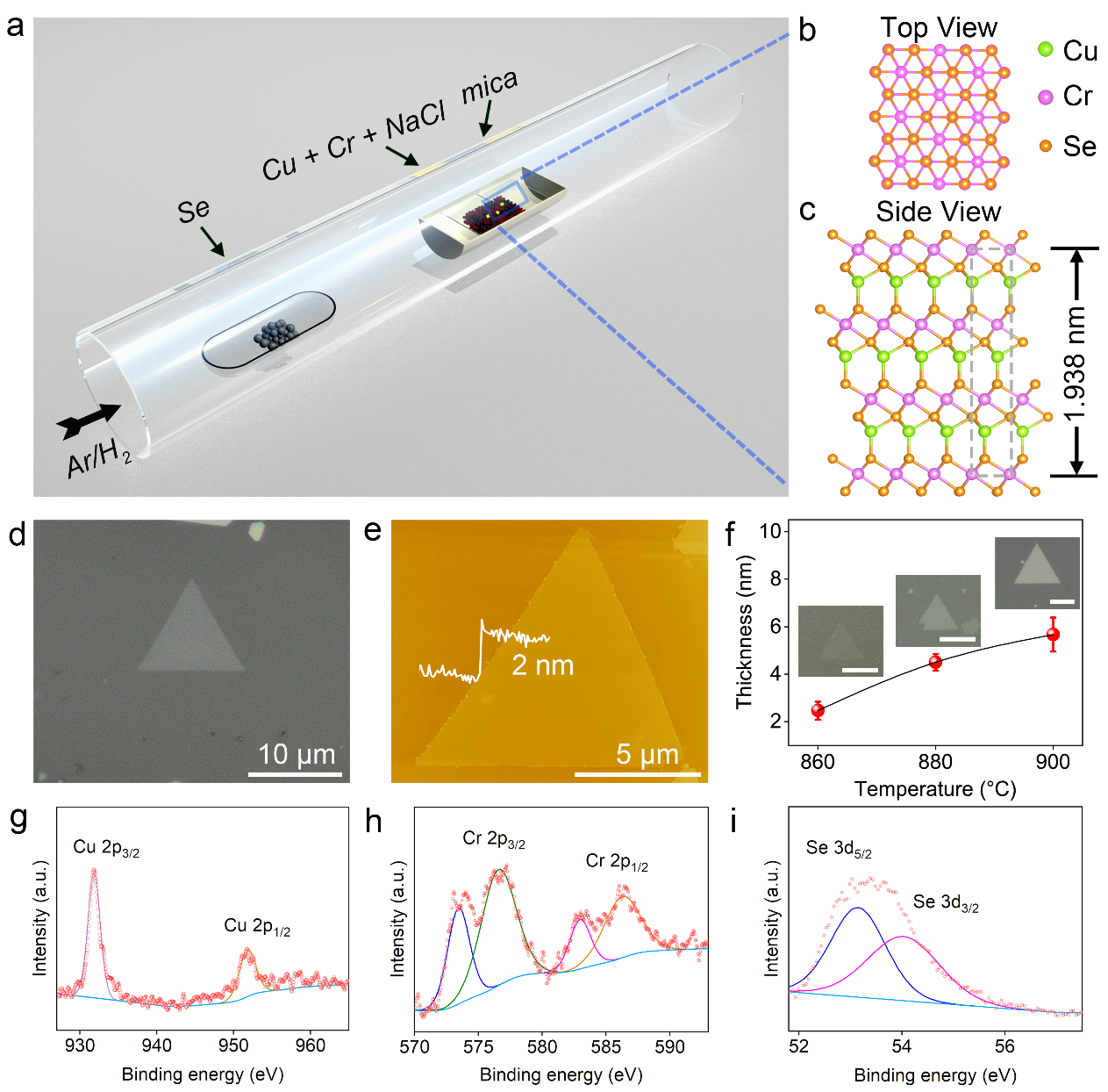 本文采用CVD法合成了CuCrSe2納米片,生長過程如圖1a所示。CuCrSe2原子結構如圖1b和1c所示。CuCrSe2晶體屬于R3m空間群,晶格常數a=b=0.36768nm,c=1.938nm。CuCrSe2可認為是準2D晶體結構,其中Cu原子插層進入到以3R順序堆疊的CrSe2層間,并占據四面體配位。Se的反應溫度、Ar氣流速和生長溫度都對CuCrSe2晶體生長存在影響。如圖1f所示,通過對生長溫度進行調控,從而可以調控CuCrSe2納米片的厚度。此外,如圖1g-i所示,利用X射線光電子能譜(XPS)對CuCrSe2納米片中的Cu、Cr和Se元素價態進行研究,各元素價態與之前文獻報道一致。綜上所述,我們合成出高質量的CuCrSe2晶體材料。
