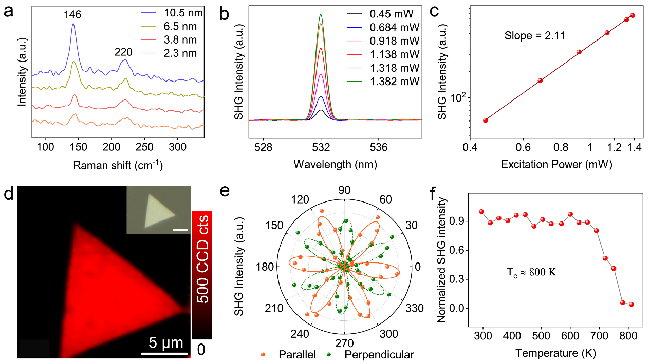 圖2.CuCrSe2納米片的拉曼光譜和SHG表征