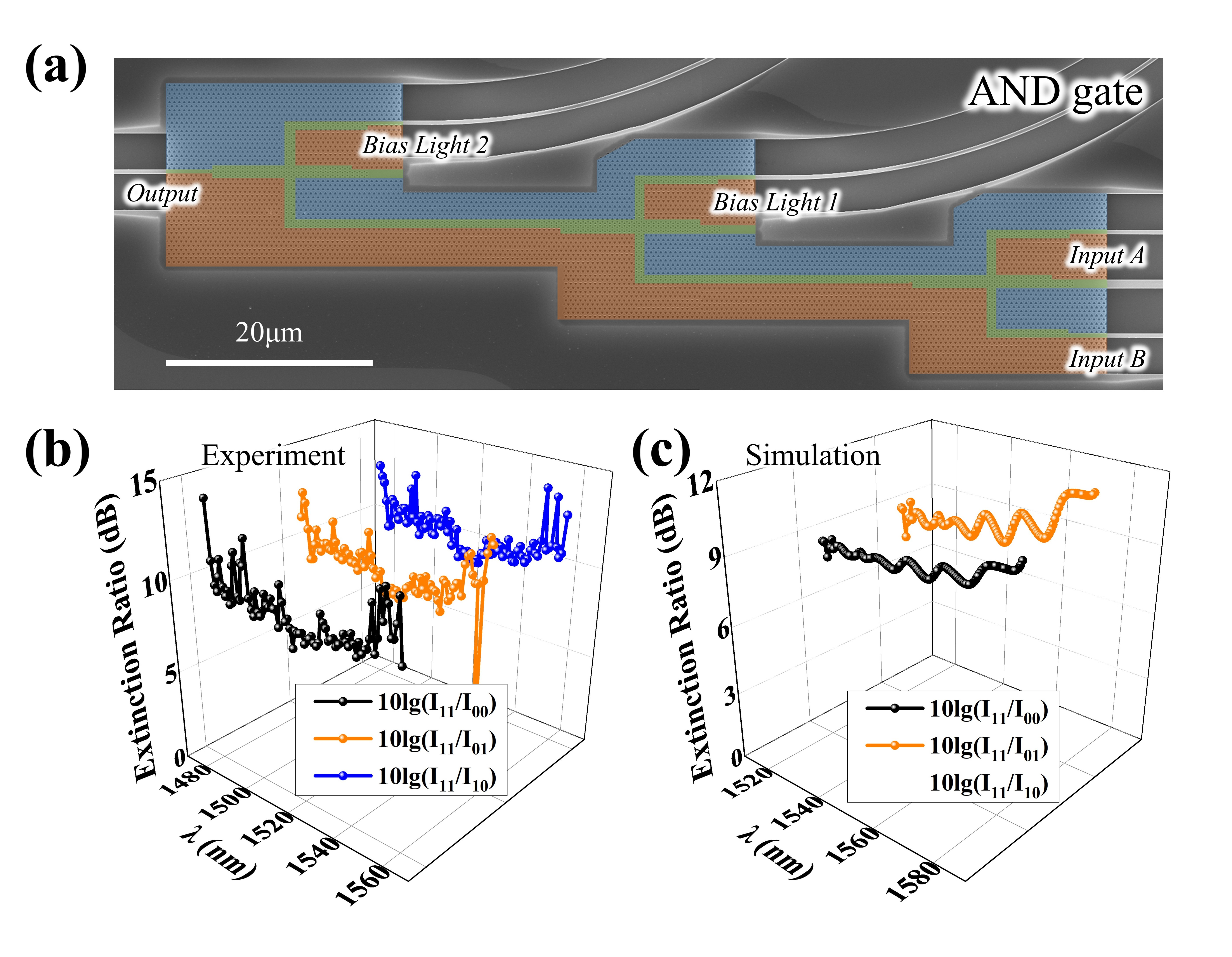 倍。當其中一個輸入信號(輸入A和輸入B)開啟時,輸出端口發生干涉相消現象,輸出信號為0。對于其他輸入狀態(輸入信號都開啟或關閉),輸出幅度不為零,對應邏輯輸出信號為1。消光比的實驗和模擬結果分別如圖3b和3c所示。實驗結果表明,在1480-1580 nm的通信頻段內,工作帶寬約為100 nm (ER>20 dB),最大消光比達到25.72 dB。理論和實驗結果均表明,XNOR門具有良好的效率。使用同樣的方式,研究人員分別實現了NAND(偏置光的振幅是輸入A(B)的2倍), NOR(偏置光的振幅為輸入A(B)處振幅的0.75