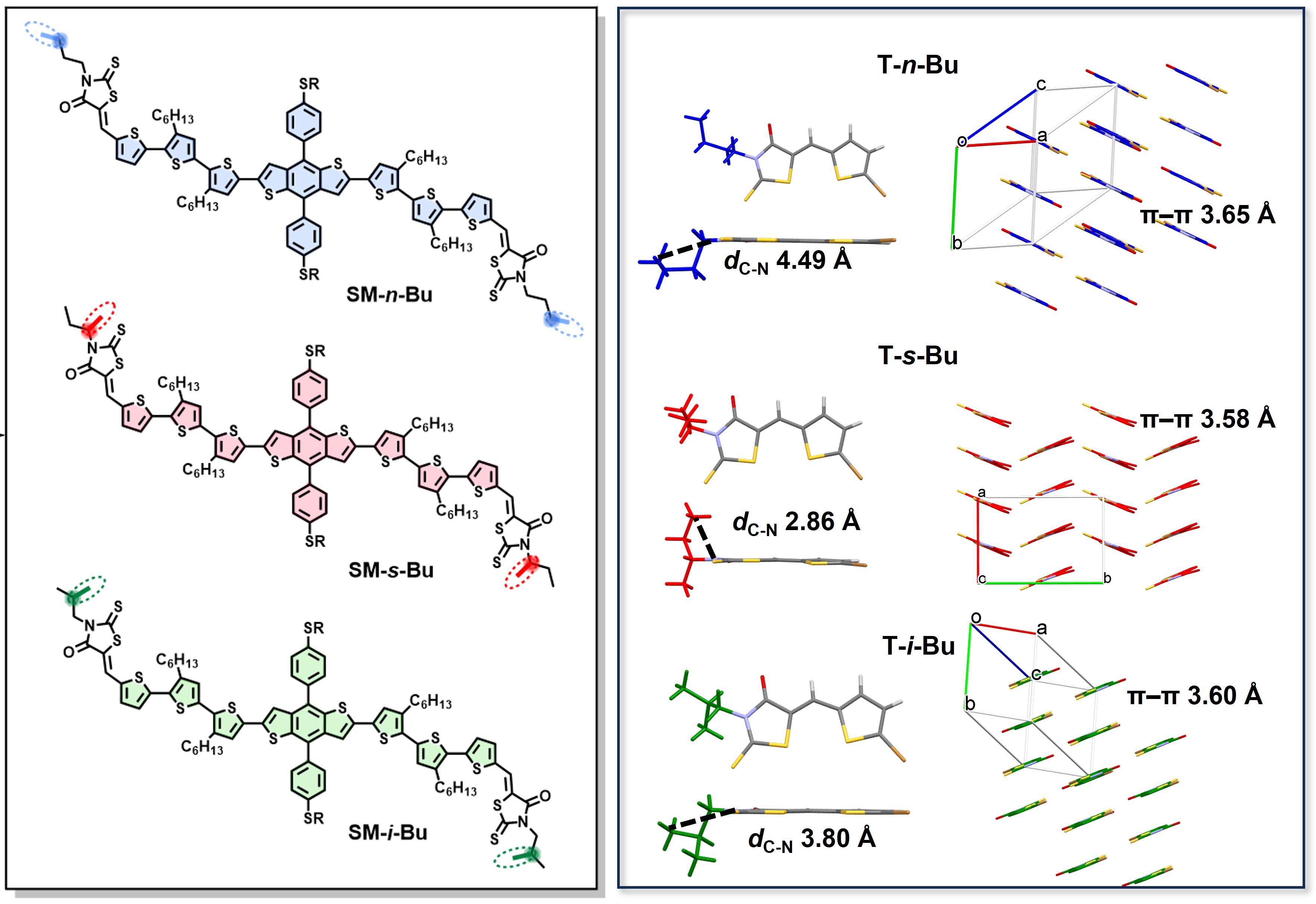 圖1:端基烷基鏈異構化小分子給體分子結構以及模型化合物的晶體堆積圖對比