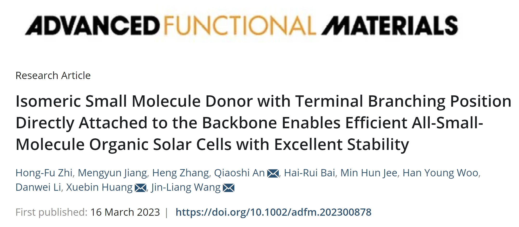 近期,北京理工大學化學與化工學院王金亮教授團隊在異構化小分子給體材料合成及其在高效率兼具穩定性好的全小分子有機太陽能電池的應用研究方面取得重要進展,相關研究成果發表在材料類國際頂級期刊《Advanced Functional Materials》(DOI: 10.1002/adfm.202300878)上,題為“Isomeric Small Molecule Donor with Terminal Branching Position Directly Attached to the Backbone Enables Efficient All-Small-Molecule Organic Solar Cells with Excellent Stability”。北京理工大學為唯一通訊單位,化學與化工學院王金亮教授、安橋石特別研究員、黃學斌副教授為共同通訊作者,碩士研究生支鴻富為第一作者。