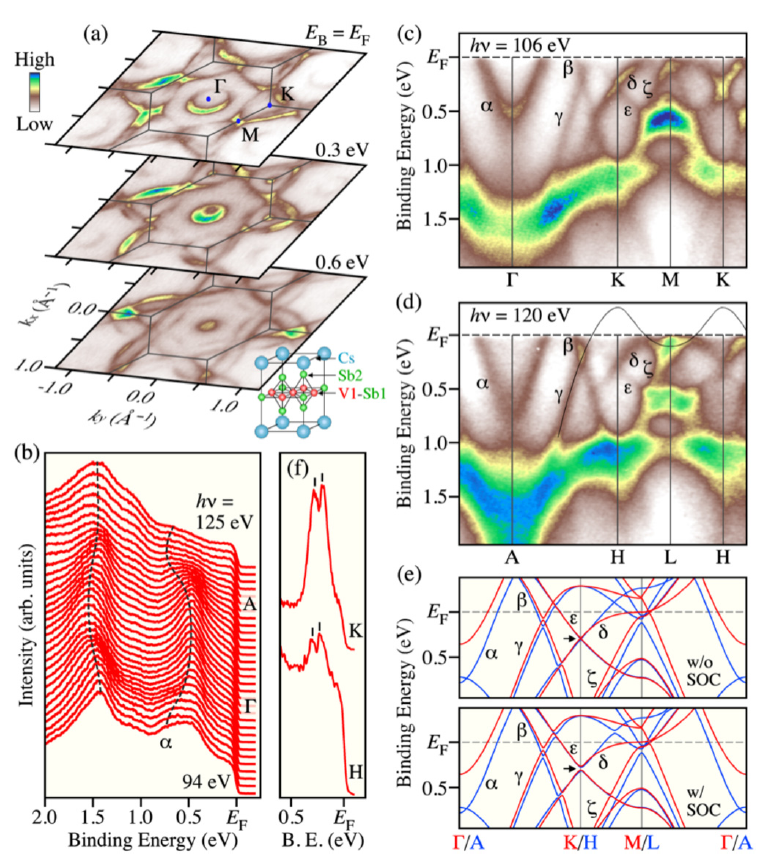 Kagome結構材料中通常會形成平帶、鞍點以及具有線性色散關系的狄拉克點,為了對該體系材料的能帶結構進行全面而深入的研究,研究團隊與日本東北大學的T. Sato課題組一起,利用角分辨光電子能譜(ARPES)研究了CsV3Sb5材料的電子能帶結構及其調控。