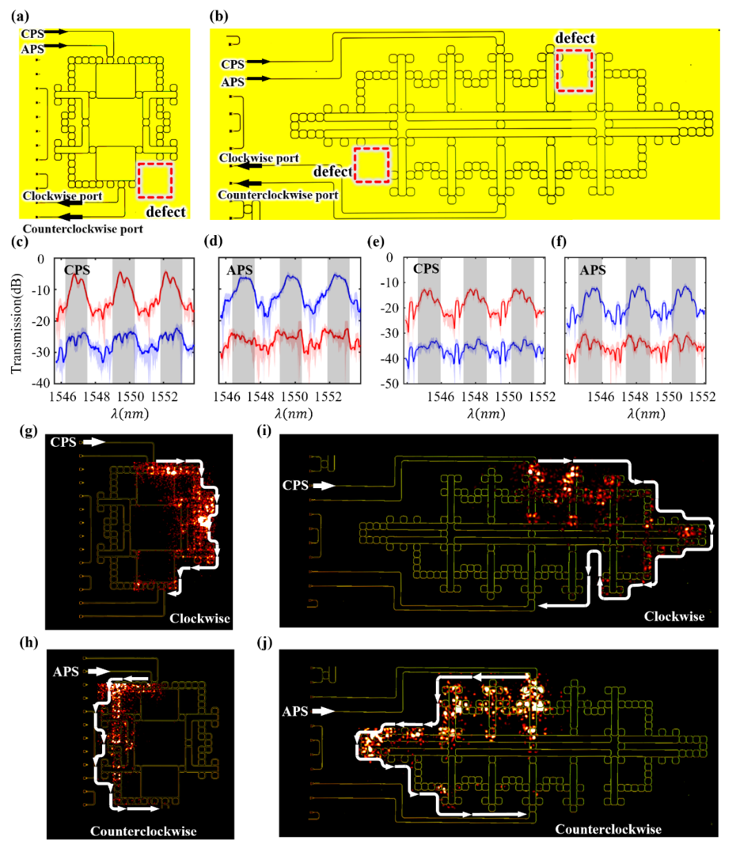 為了研究雙曲光拓撲絕緣體的魯棒性,研究人員分別在面心和體心雙曲光拓撲結構的邊界處引入缺陷(紅色虛線框),如圖5a和5b所示。隨后,研究人員測量了缺陷雙曲光拓撲結構的透射譜和近場分布。面心和體心雙曲結構的透射譜分別繪制在圖5c-5d和5e-5f中。拓撲頻率激發下,面心和體心結構的近場分布分別顯示在圖5g-5h和5i-5j中。結果顯示,即使引入缺陷,雙曲光拓撲邊界態仍然可以展現具有贗自旋選擇特性的拓撲邊緣單向傳導。