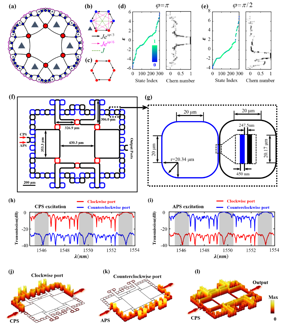 首先,研究人員考慮了龐加萊圓盤上的{6,4}面心雙曲拓撲晶格模型,如圖1a-1c所示。通過引入最近鄰、次近鄰和次次近鄰格點間的復數耦合(一半原包內),可以破壞系統的時間反演對稱性,從而引入非平庸的拓撲性質。圖1d和1e分別顯示了兩種耦合相位下的能譜和實空間陳數計算結果,其中能譜格點的顏色表征相應特征態的邊緣局域化強度。可以看出,在零能附近存在具有非平庸陳數的雙曲邊界態。隨后,研究人員通過設計環形諧振腔的空間排布和耦合,理論構造了對應于{6,4}雙曲拓撲晶格模型的片上光學結構,如圖1f所示。圖1g為雙曲拓撲光學結構的局部放大示意圖。進一步,研究人員利用有限元方法,對所設計的雙曲拓撲光學結構進行全波模擬。圖1h和1i分別顯示了順時針贗自旋(CPS)和逆時針贗自旋(APS)激發下,對應于相反傳播方向輸出端口的透射譜計算結果。計算結果顯示,在拓撲邊界態的頻率范圍內,CPS和 APS分別在相反傳播方向的出射端口展現高透射率。而在平庸邊界態和體態對應的頻率范圍內,展現較低透射率。圖1j和1k顯示了拓撲頻率激發下CPS和 APS的穩態場分布結果。圖1l為平庸體態頻率激發的場分布結果。計算結果表明,在拓撲態頻率范圍激發下,輸入光信號可以展現贗自旋選擇特性的拓撲邊緣傳導特性。