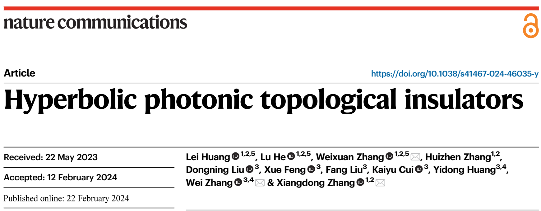日前,北京理工大學物理學院張向東教授課題組與清華大學電子工程系黃翊東教授課題組合作,在雙曲光拓撲絕緣體研究方面取得重要進展。相關工作發表在Nat. Commun.  15, 1647 (2024)上。研究工作得到國家重點研發計劃,國家自然科學基金和中國科協青年人才托舉工程的資助。北京理工大學物理學院博士生黃磊、何路(現為光電學院特立博士后)和張蔚暄副教授為論文共同第一作者,張向東教授、清華大學張巍教授和張蔚暄副教授為通訊作者。另外,北京理工大學張慧珍副研究員,清華大學劉仿教授、馮雪副教授、崔開宇副教授、劉東寧博士也對此工作做出了貢獻。