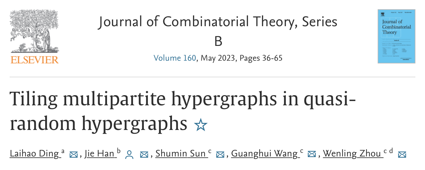 韓杰與山東大學的王光輝教授團隊和韓國科學技術院大學的JaehoonKim教授在最新的研究中決定了獨立數次線性圖中團因子存在性的最優度條件,并否定了前人提出的猜想。在另一研究中,韓杰與華中師范大學教師丁來浩、山東大學王光輝教授團隊研究了擬隨機超圖中退化F因子存在性的最優密度問題并得到了一系列成果。其中關于3一致超圖中