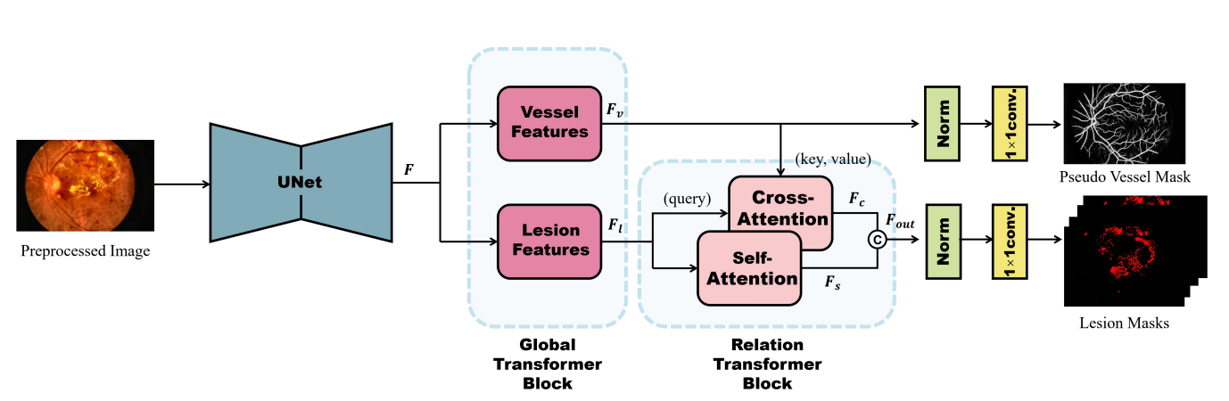 在近幾年,國內(nèi)外學者嘗試通過訓練有素的人工智能來分割眼底影像中糖尿病病變的關鍵病灶。然而,病灶圖案的小尺寸和易混淆的眼底復雜結(jié)構(gòu)經(jīng)常使得人工智能模型經(jīng)常錯分病灶。許廷發(fā)教授團隊首次引入血管信息作為先驗知識來解決這一科學難題,提出了一個端到端的基于transformer結(jié)構(gòu)的多病灶分割網(wǎng)絡RTNet。針對血管異常總是產(chǎn)生病灶的直接或間接原因,將病灶特征和血管信息分別作為transformer結(jié)構(gòu)的查詢值和關鍵值輸入,使得病灶像素的決定血管的分布情況。此外,針對多目標分割問題的難題,該團隊研究發(fā)現(xiàn)不同病灶的出現(xiàn)和分布符合疾病發(fā)展的規(guī)律,從這一病理規(guī)律出發(fā)提出了一個全新的綜合全局和細節(jié)信息的自注意結(jié)構(gòu),實現(xiàn)了從多目標同時提取病灶特征。