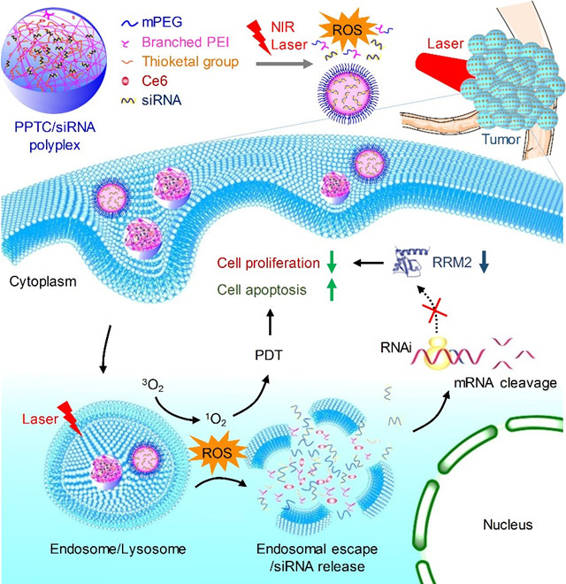 基于以上考量,該研究設(shè)計了一種聚乙二醇(PEG)修飾、ROS響應(yīng)的陽離子聚合物PPTC,該陽離子聚合物可高效負(fù)載抗RRM2基因的siRNA藥物,形成穩(wěn)定、均一的PPTC/siRRM2納米藥物體系。RRM2是一種脫氧核糖核酸酶還原亞基,與多種癌癥的發(fā)生發(fā)展密切相關(guān),沉默RRM2可促進腫瘤細(xì)胞發(fā)生凋亡。該復(fù)合物進入到細(xì)胞后,在近紅外光的照射下能有效降解聚合物、產(chǎn)生ROS,ROS可破壞內(nèi)涵體膜、促進內(nèi)涵體逃逸,同時破壞細(xì)胞膜使腫瘤細(xì)胞發(fā)生凋亡。而進入胞質(zhì)的siRNA抑制RRM2的表達(dá),可有效阻止癌細(xì)胞增殖,從而從“促凋亡、抑增殖”雙角度實現(xiàn)協(xié)同抗腫瘤治療(圖1)。