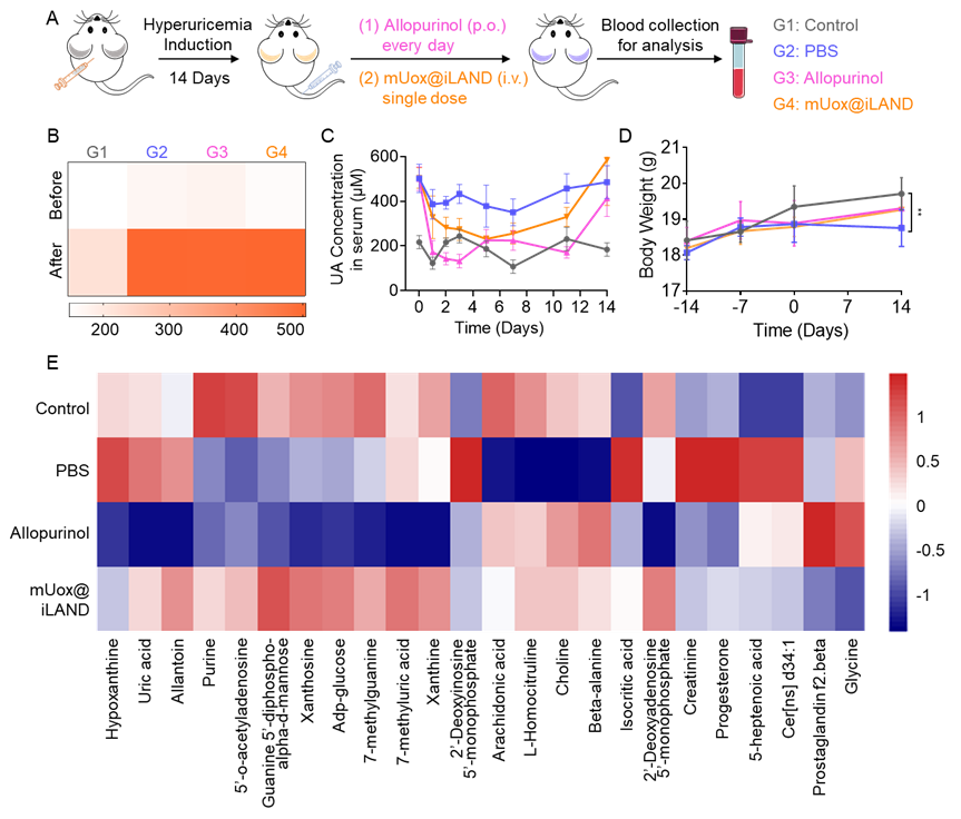 進一步,該工作還自主建立了一種新的高尿酸血癥動物模型,與文獻報道的其它高尿酸血癥動物模型(僅能在數小時內維持較高的血尿酸水平)不同,該新模型的血尿酸濃度可在數周內穩定維持在高水平。通過持續監測血尿酸水平,mUox@iLAND在兩種小鼠高尿酸血癥模型中均表現出了良好的降尿酸效果,實驗終點對小鼠肝臟及血清分別進行非靶向代謝組學分析,結果進一步驗證了mUox@iLAND的治療效果和安全性(圖4)。