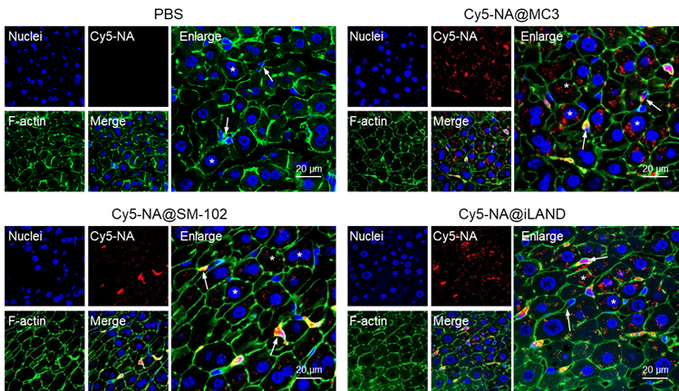 圖3 iLAND通過主動靶向肝實質細胞在肝臟積累。星號代表肝實質細胞,箭頭代表非實質細胞(包括Kupffer細胞、星狀細胞等)