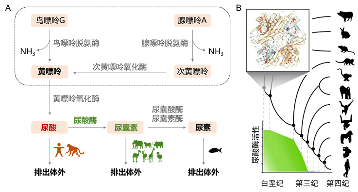 圖1 嘌呤代謝通路與進化的關系。A 尿酸代謝方式示意圖;B 尿酸酶進化示意圖