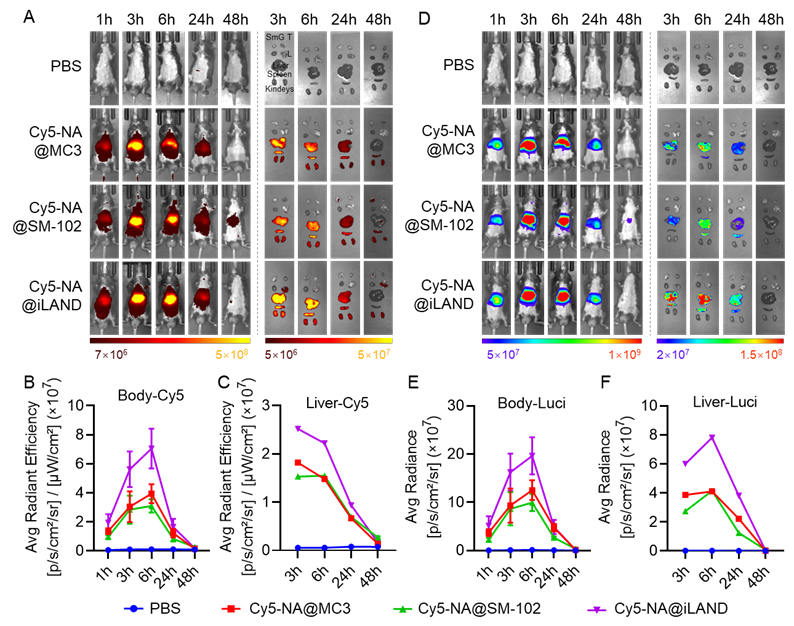 該論文作者基于前期自主研發的可電離脂質分子A1-D1-5( Huang Y*, et al. Sci Adv. 2022; PCT/CN2021/094937 )設計和制備了一種高效遞送mRNA(mUox)并表達尿酸酶的脂質納米顆粒體系(mUox@iLAND)。首先,體內mRNA表達及分布實驗數據表明,與已上市的可電離核酸遞送脂質DLin-MC3-DMA、SM-102的脂質納米顆粒相比,A1-D1-5脂質納米顆粒(iLAND)表現出相當甚至更優的核酸遞送能力(圖2)。