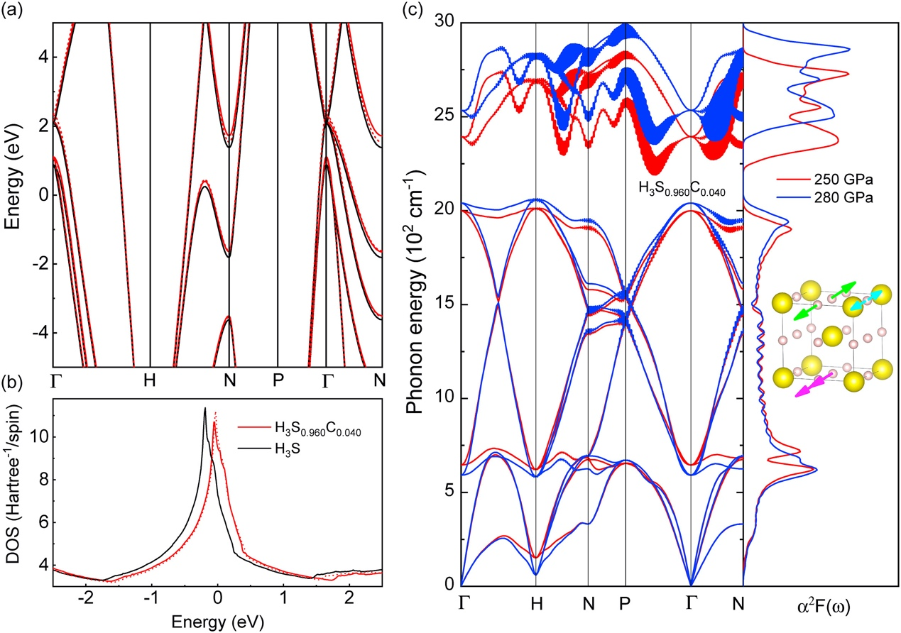 圖1 (a)(b) Im-3m相H3S的能帶結構和DOS:H3S@220GPa (黑線),H3S0.960C0.040@220GPa (紅色實線),H3S0.960C0.040@240GPa (紅色虛線)。(c)聲子色散譜和Eliashberg譜函數:H3S0.960C0.040@250GPa (紅線),H3S0.960C0.040@280GPa (藍線)。