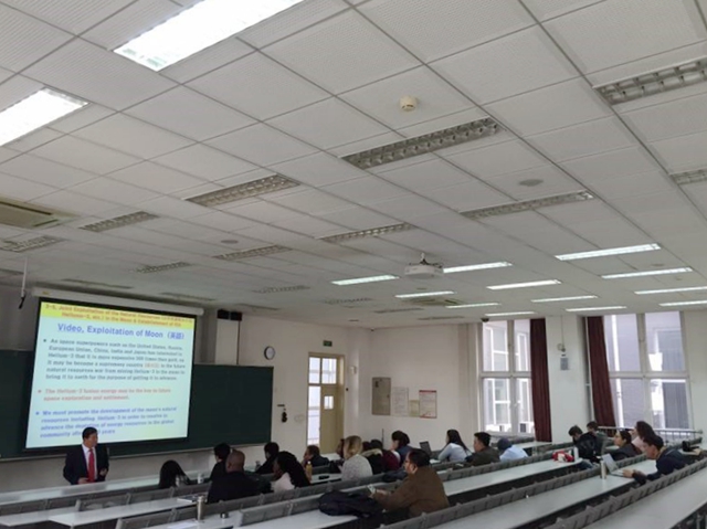 11月29日,金斗煥以“人類能夠在月球和火星上生存”為專題進(jìn)行了講授,介紹了美國、俄國、中國、日本、印度和韓國對月球和火星的空間探索,《1979年月球協(xié)定》的內(nèi)容以及探索月球或其他天體上自然資源的活動中所存在的法律問題。最后,金斗煥還指出建立ISA的必要性。講座結(jié)束后,各位學(xué)生踴躍發(fā)言與金斗煥進(jìn)行交流。