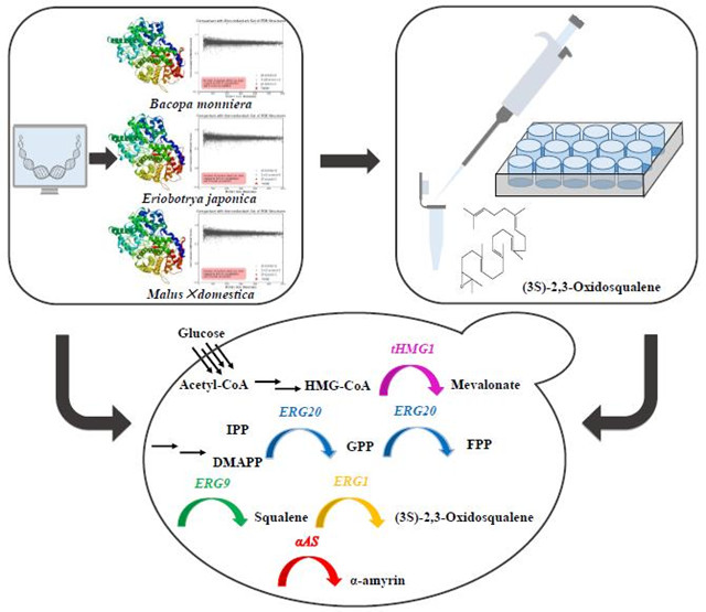 萜類化合物是植物次級代謝產物中最大的一個家族,廣泛分布于自然界中,α-香樹脂醇是植物當中重要的五環三萜,具有重要的生理和藥理活性。α-香樹脂醇是由(3S)-2,3-氧化鯊烯在氧化鯊烯環化酶蛋白家族α-香樹脂醇合酶(α-AS)的催化下形成的。由于α-香樹脂醇在植物中的含量極低,分離純化步驟繁雜,目前尚未商業化開發生產。利用整合了高效α-AS的工程化釀酒酵母,可用作α-香樹脂醇的可持續生產方案。